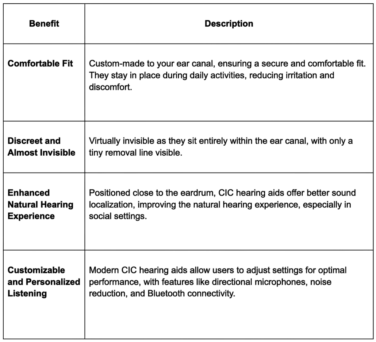 - CIC hearing aids are discreet and fit entirely within the ear canal.