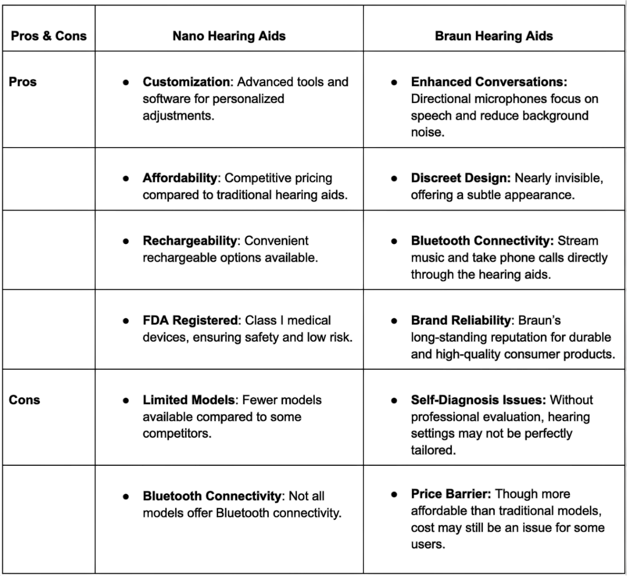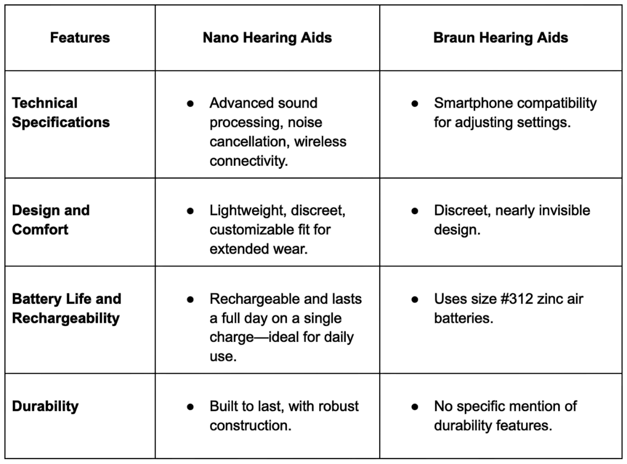 Both Nano and Braun cater to individuals with perceived mild to moderate hearing loss who are looking for affordable, easy-to-use solutions. Nano focuses on delivering customization and advanced features, offering a more personalized auditory experience. Braun, on the other hand, emphasizes design comfort and user-friendly setup, ensuring that users can easily adjust their hearing aids for optimal performance, despite relying on non-rechargeable batteries.