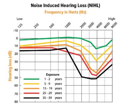 In fact, it's not just about how loud the noise is, but also how long and how often you're exposed to it. Even everyday activities, like mowing the lawn or using power tools, can contribute to hearing loss over time. A single gunshot in close proximity without hearing protection can be enough to cause permanent damage. The image below show a noise induced hearing loss diagram.