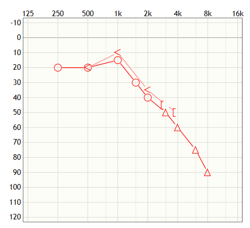 Imagine looking at a graph that shows the range of sounds from low to high frequencies. For most people with hearing loss, the graph would show a decline in the ability to hear higher frequencies, resembling a ski slope. The image below shows an audiogram of high-frequency hearing loss.