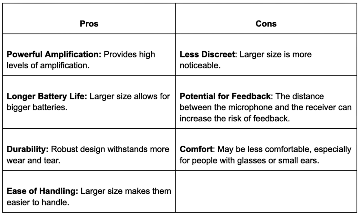 - Severe Hearing Loss: BTE hearing aids provide powerful amplification and may offer larger battery capacity, which means they may be more suitable for individuals with severe hearing loss (always check with the manufacturer, as OTC devices are only suitable for perceived mild to moderate hearing loss).