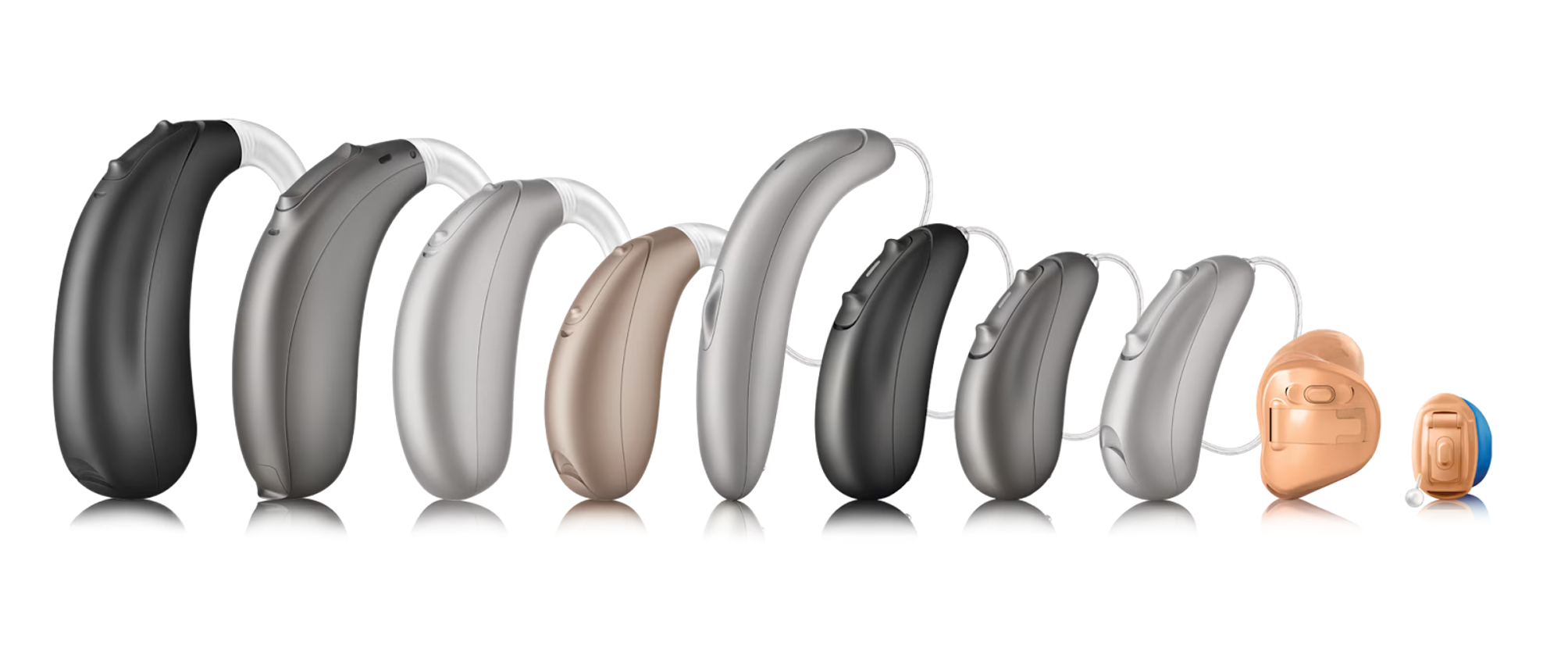 There are some hearing aid designs available for both Unitron and Phonak brands such as behind-the-ear (BTE), receiver-in-canal (RIC), in-the-ear (ITE), in-the-canal (ITC), and completely-in-canal (CIC).